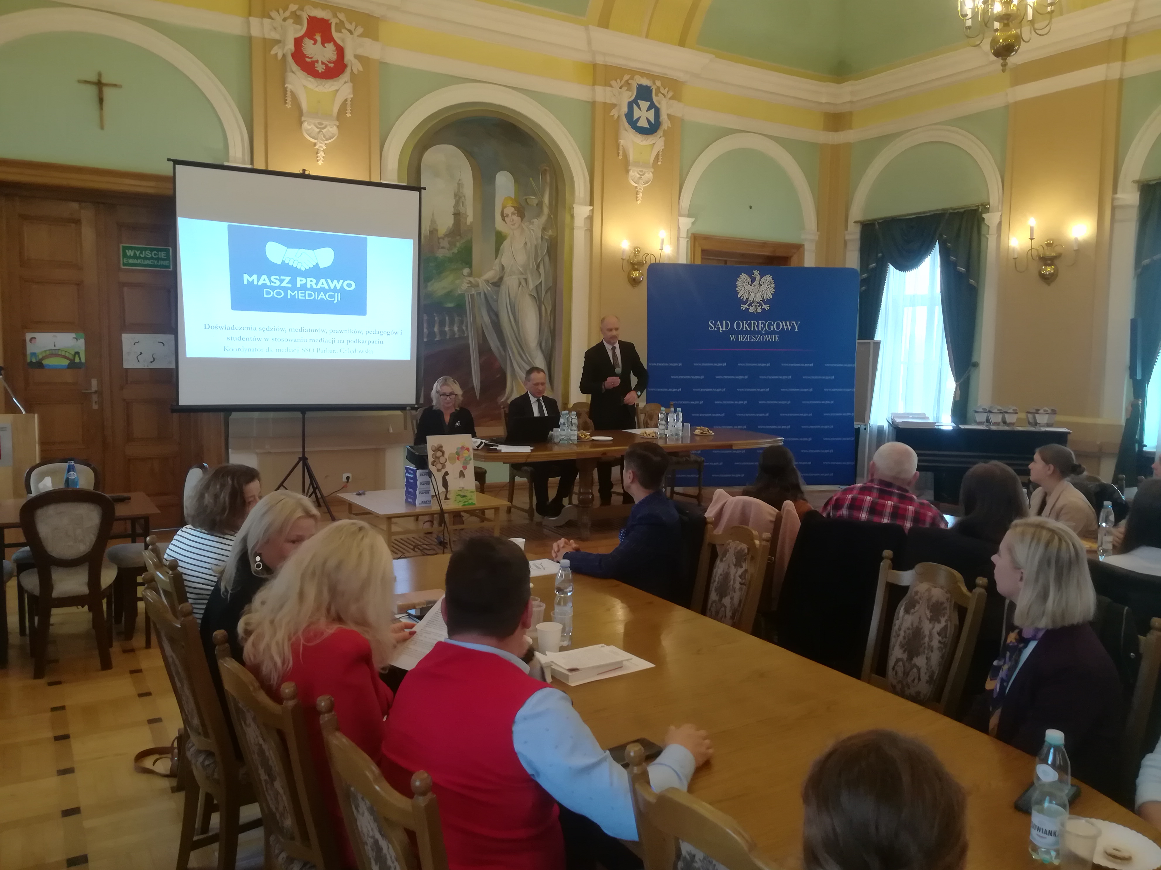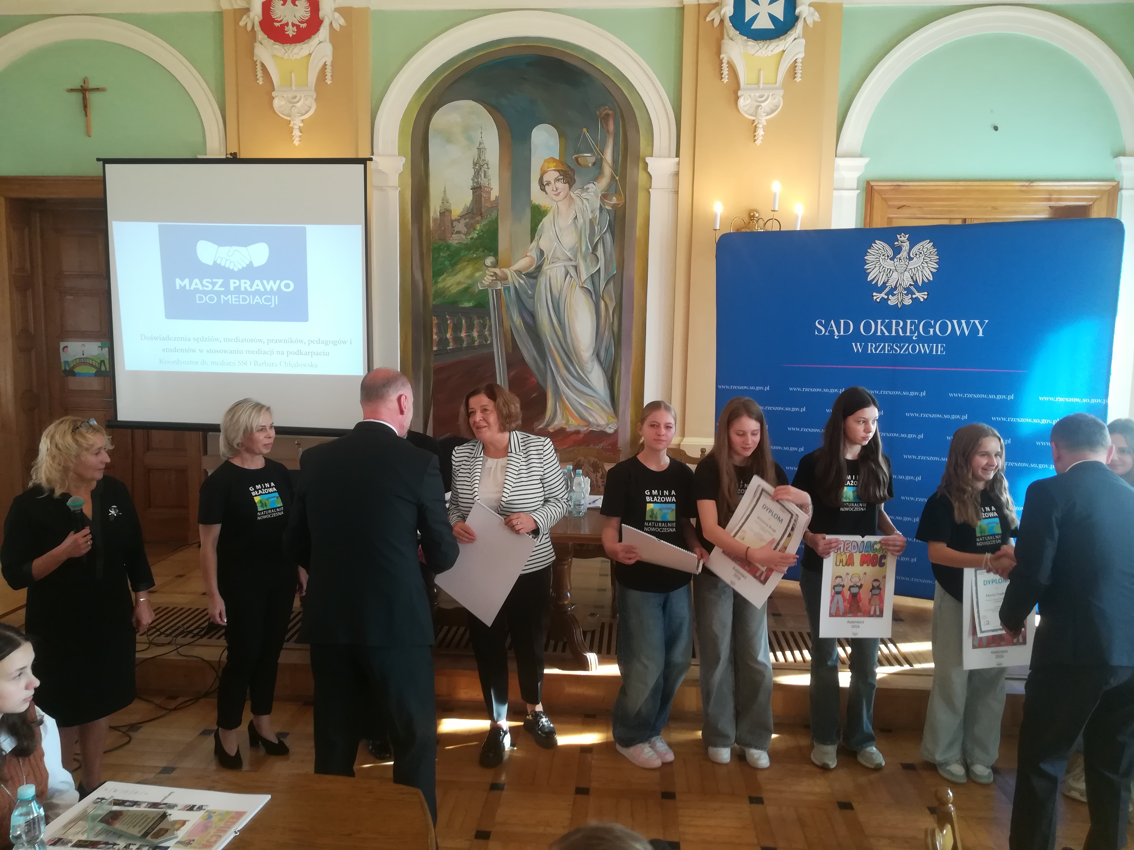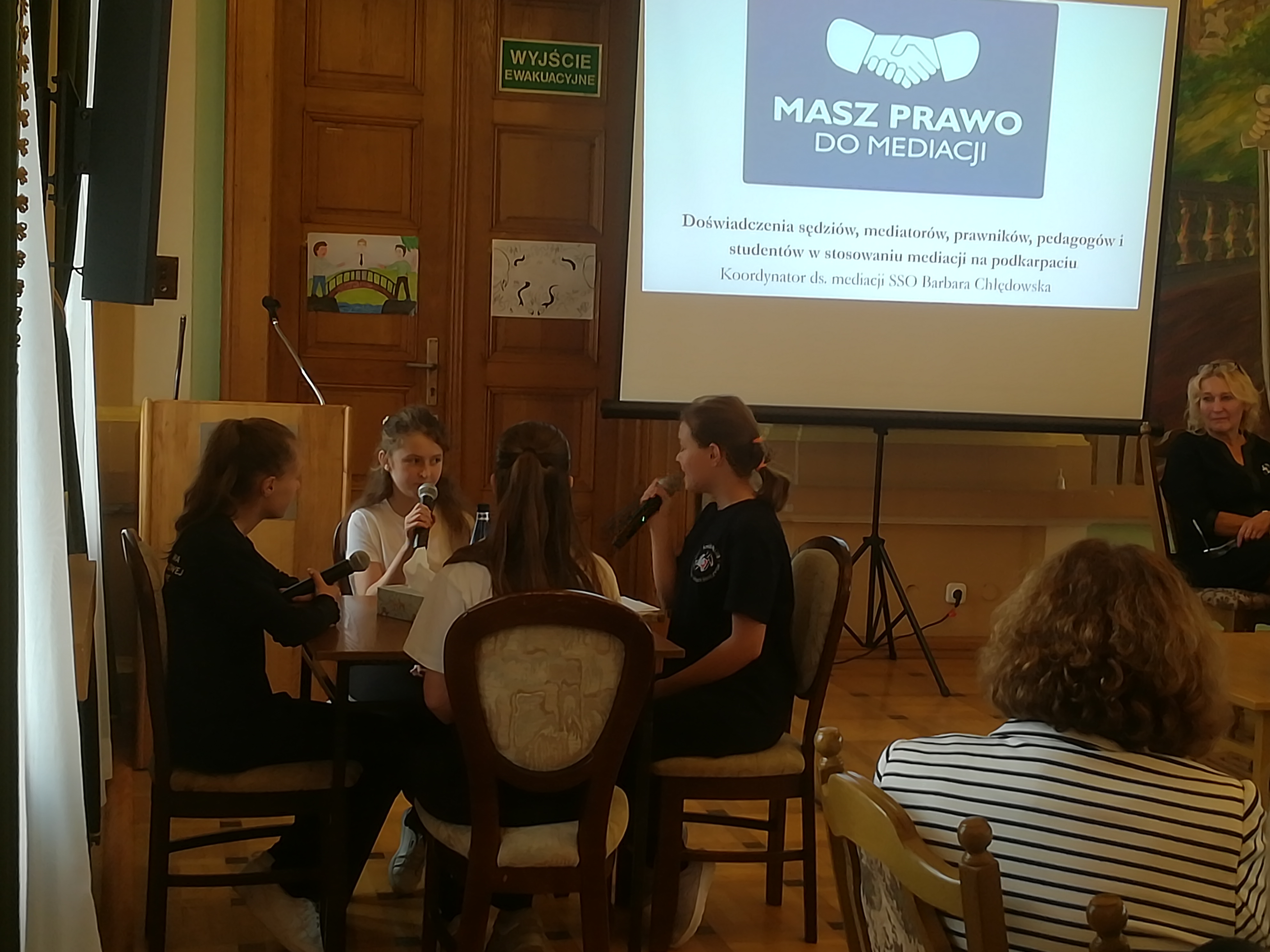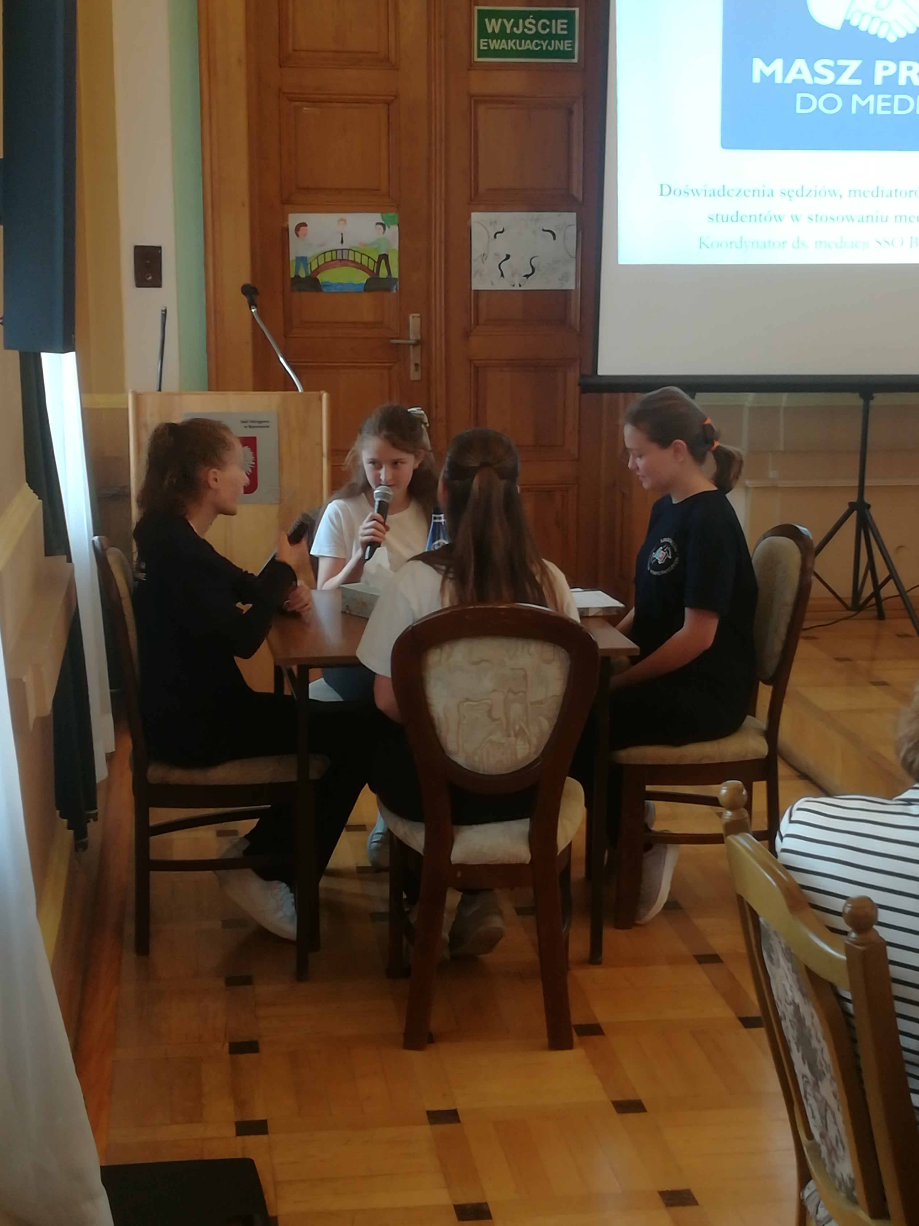 Wyjątkowym punktem konferencji było wystąpienie zwycięzców V Ogólnopolskiego konkursu na symulację mediacji – uczniów reprezentujących Szkołę Podstawową w Kamieniu Prusinie.