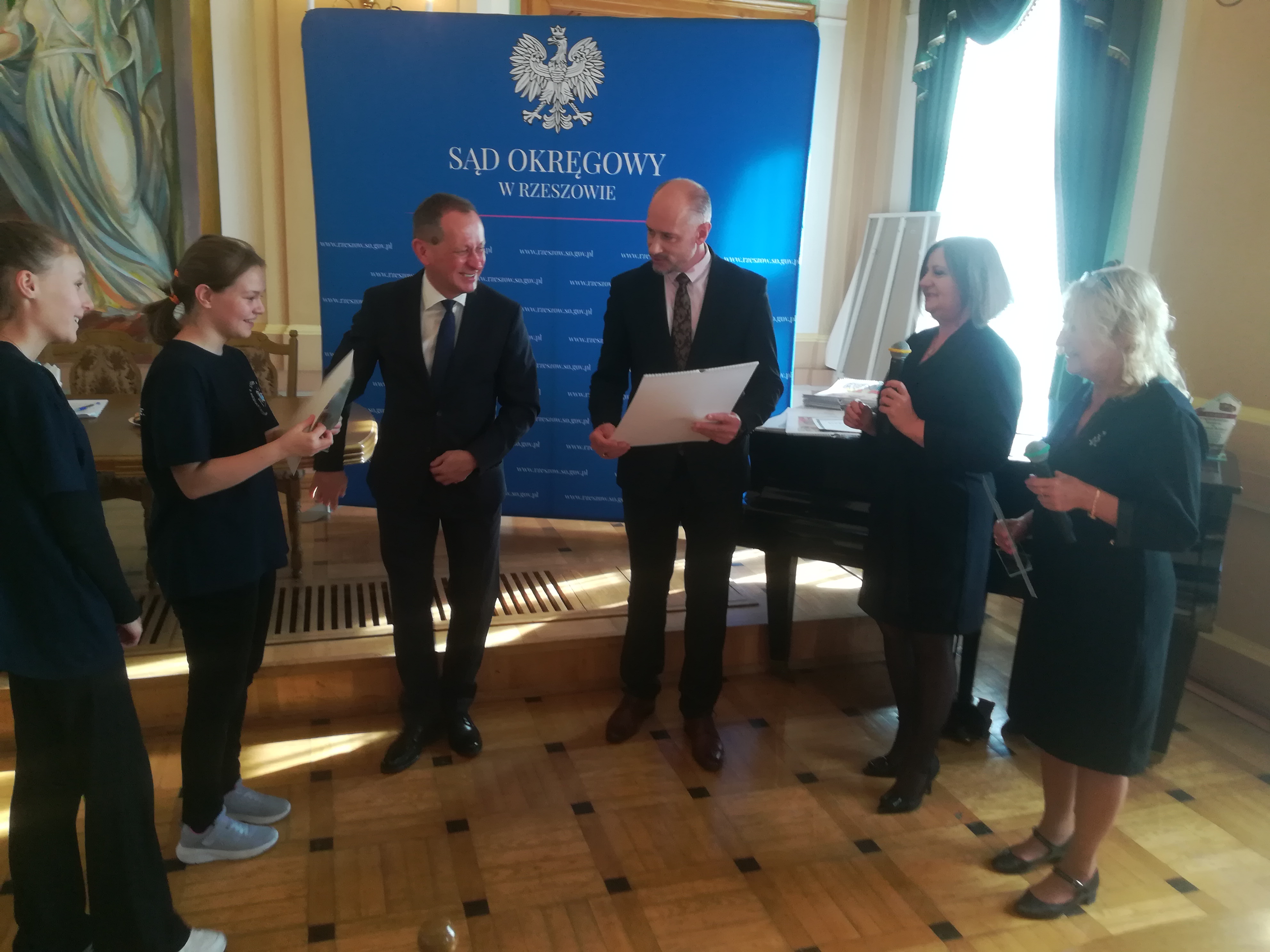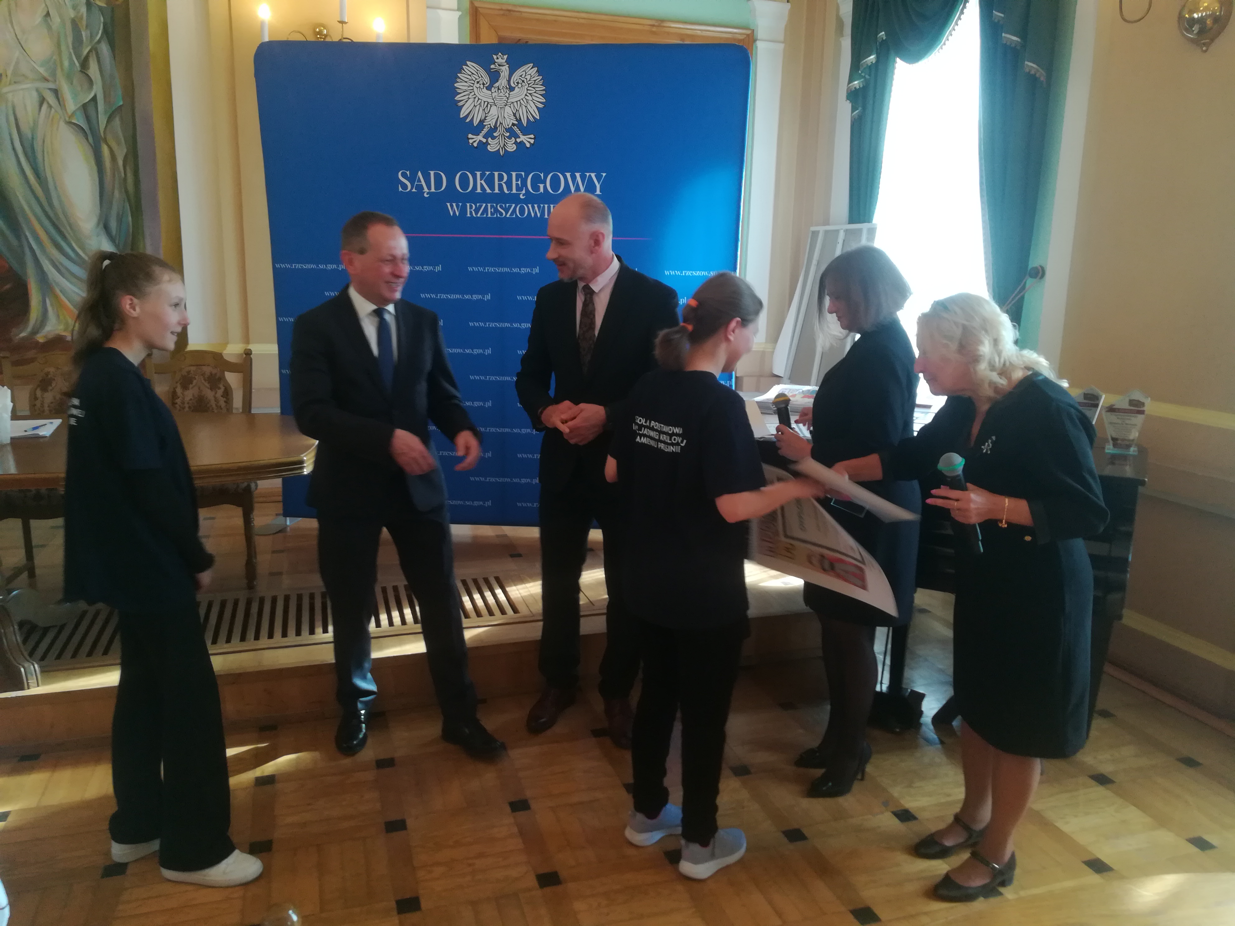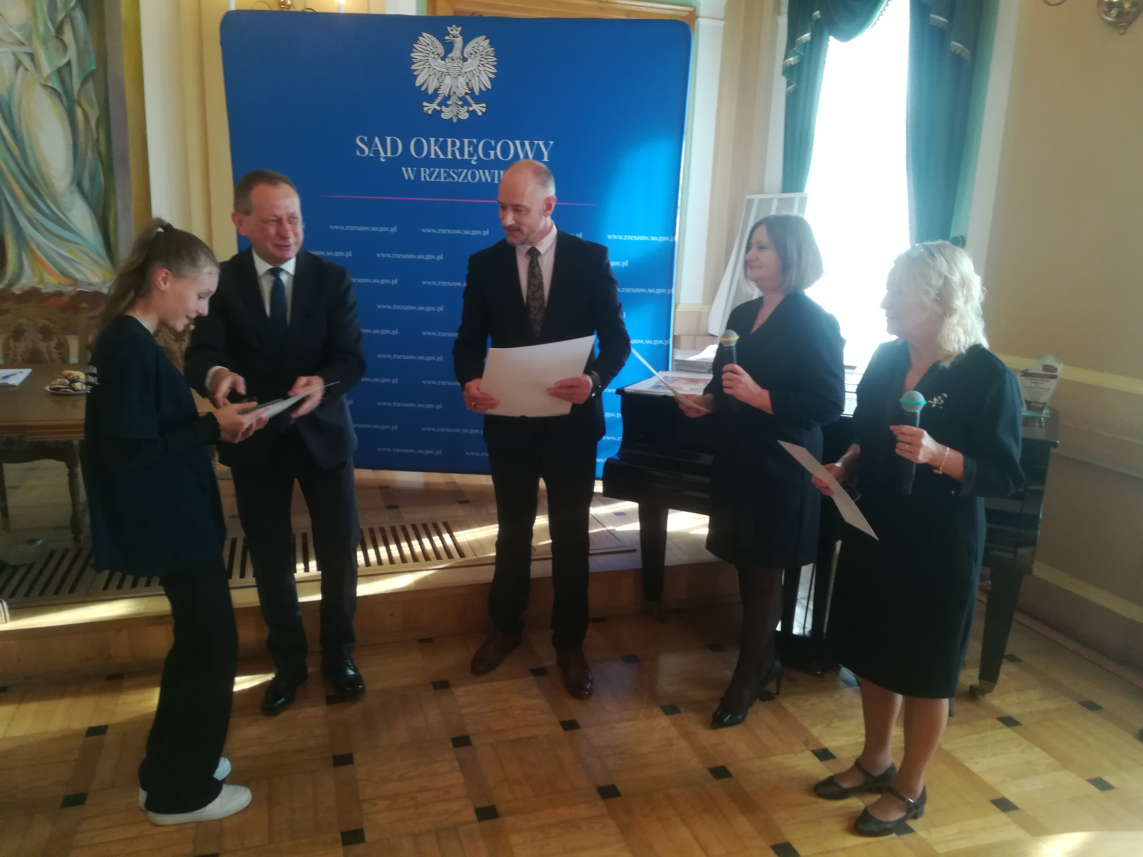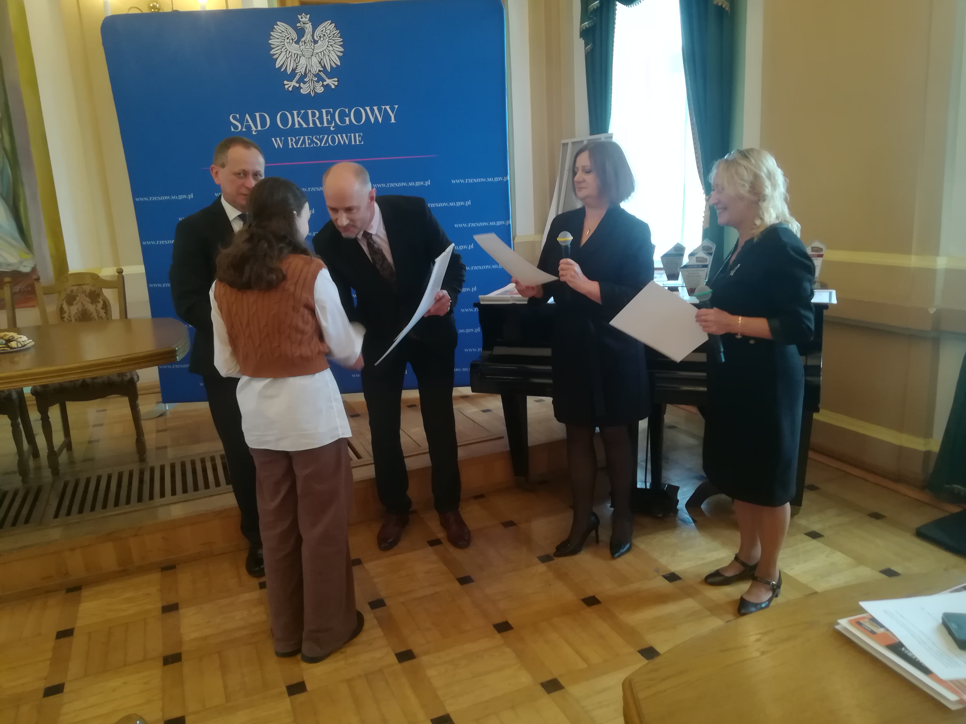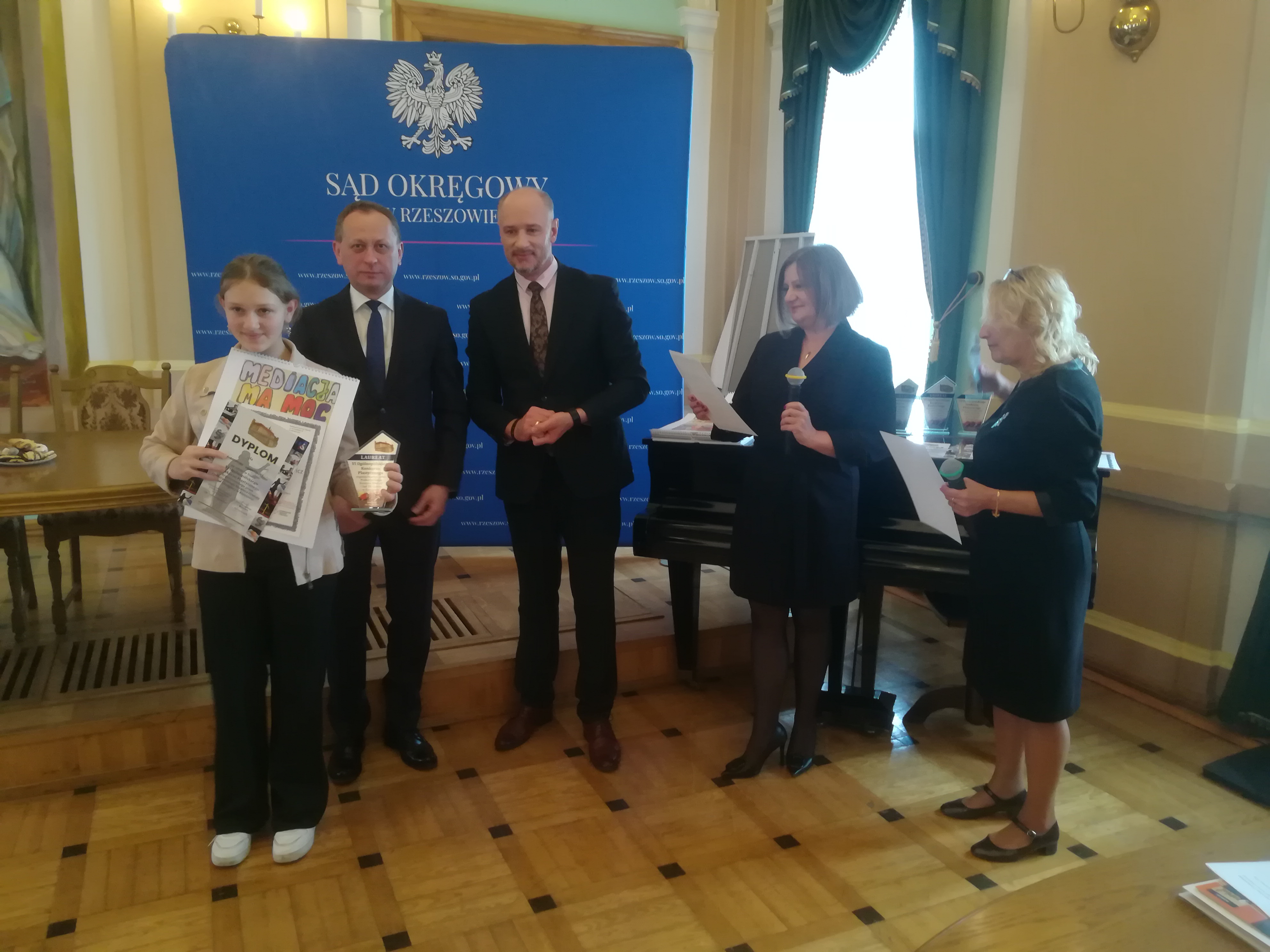 Podczas konferencji wręczono nagrody zwycięzcom VI Ogólnopolskiego konkursu plastycznego i V Ogólnopolskiego konkursu na symulację mediacji organizowanego przez Podkarpackiego Kuratora Oświaty oraz Sąd Okręgowy